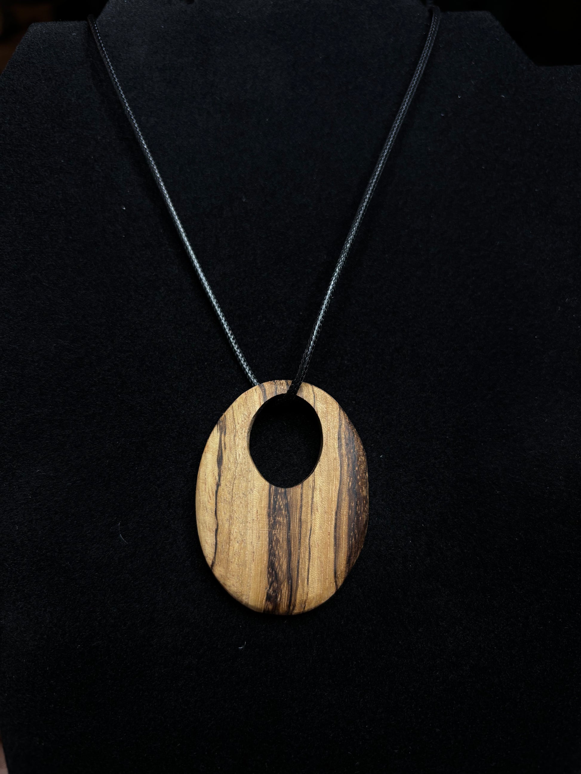 Handcrafted Zebrawood oval pendant necklace featuring bold vertical grain and open negative space — a reminder that strength isn’t solid… it’s balanced.