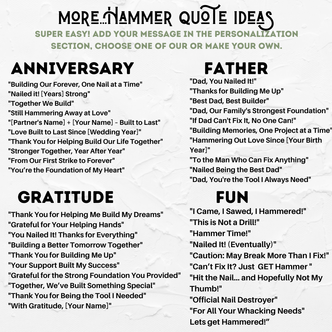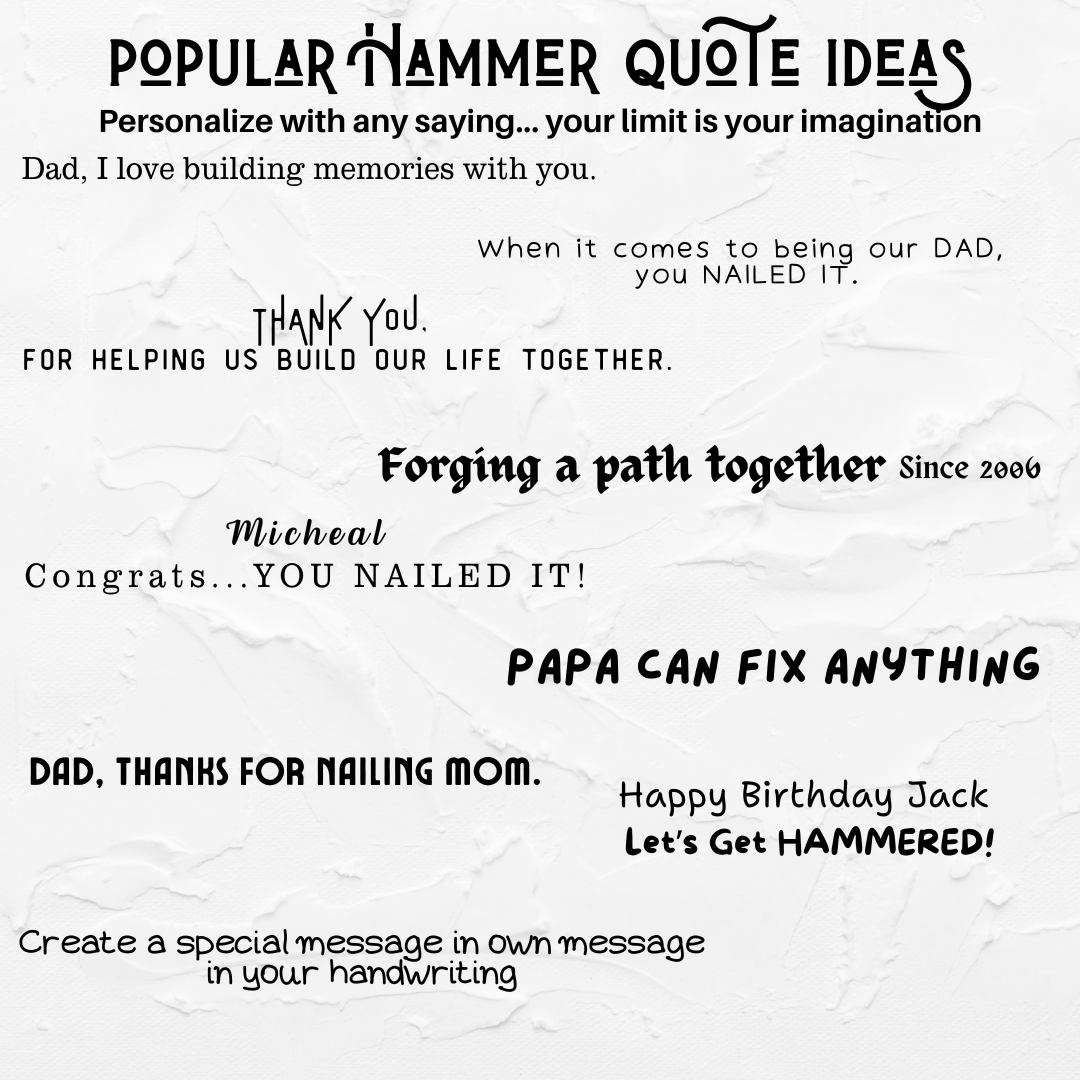 Ideal for Father’s Day, anniversaries, birthdays, or as a heartfelt “thank you” to a mentor or loved one, this hammer is a unique way to show appreciation. Whether it’s a favorite quote, a name, or an inside joke, the engraving is your chance to make it truly one-of-a-kind. This custom hammer is ready to be part of countless projects and memories for years to come.